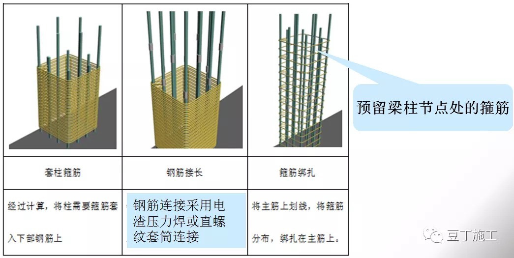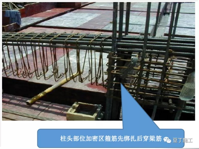 1、柱头加密箍筋数量不能少,穿梁钢筋前先将箍筋整理好。