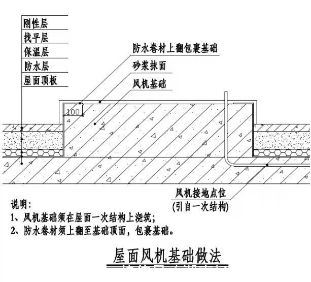 屋面防水、保温层、找平层、刚性层施工时,注意防水必须翻至风机基础边缘,以保证防水系统的严密性;抹灰或铺设风机的基础表面。